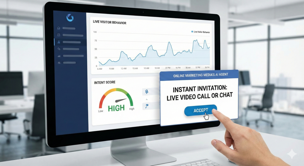 Online Marketing Media’s AI monitors real-time visitor behavior to calculate intent scores, automatically triggering personalized engagements through our AI agents—instantly inviting high-value visitors to a live video call or chat.